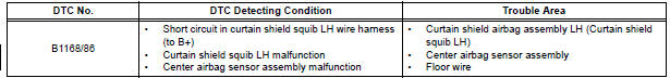 DTC B1168/86 is recorded when a short to B+ is detected in the curtain shield squib LH circuit.