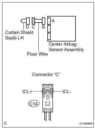 The curtain shield squib LH circuit consists of the center airbag sensor assembly and the curtain shield airbag assembly LH.