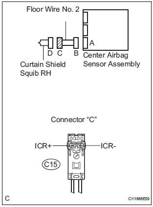 The curtain shield squib RH circuit consists of the center airbag sensor assembly and the curtain shield airbag assembly RH.