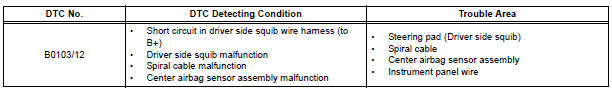 DTC B0103/12 is recorded when a short to B+ is detected in the driver side squib