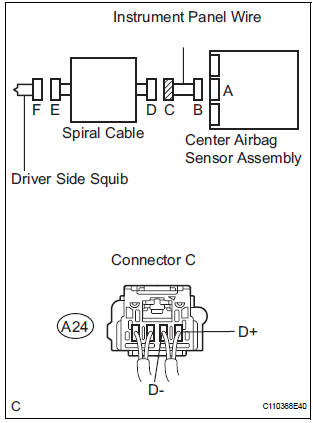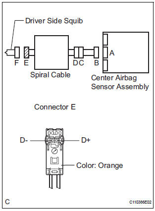 The driver side squib circuit consists of the center airbag sensor assembly,