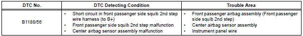 DTC B1188/56 is recorded when a short to B+ is detected in the front passenger side squib 2nd step circuit.