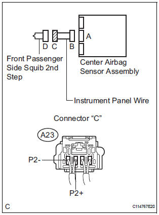 The front passenger side squib 2nd step circuit consists of the center airbag sensor assembly and the front passenger airbag assembly.