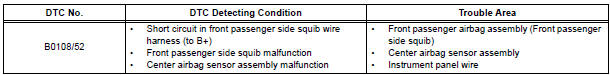 DTC B0108/52 is recorded when a short to B+ is detected in the front passenger side squib circuit.