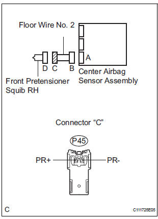 The front pretensioner squib RH circuit consists of the center airbag sensor assembly and the front seat outer belt assembly RH.