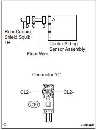 The rear curtain shield squib LH circuit consists of the center airbag sensor assembly and the curtain shield airbag assembly LH.