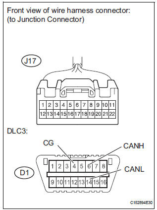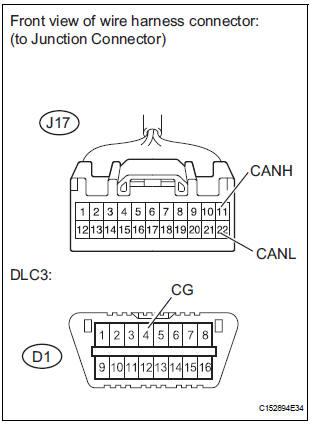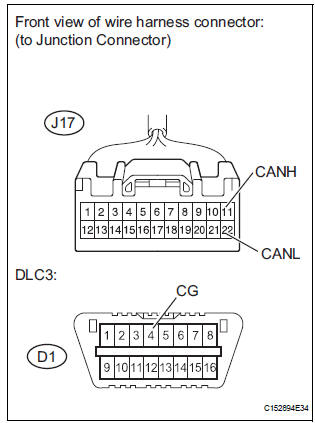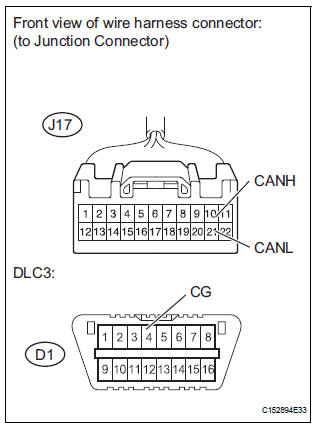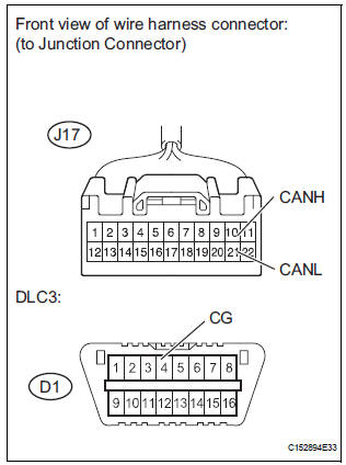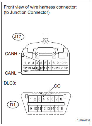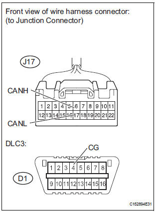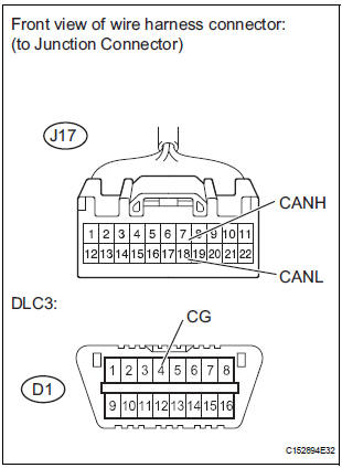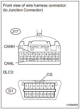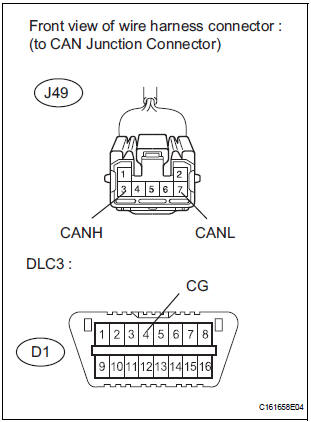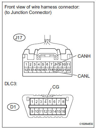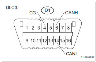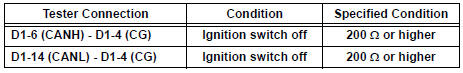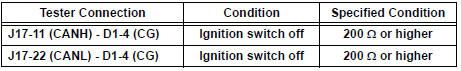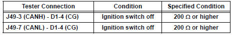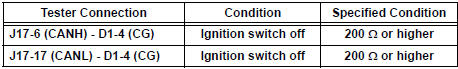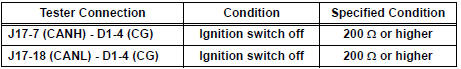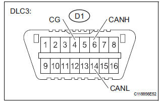 A short to GND is suspected in the CAN bus wire when the resistance between terminals 4 (CG) and 6 (CANH), or terminals 4 (CG) and 14 (CANL) of the DLC3 is below 200 Ω.