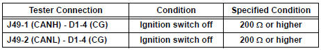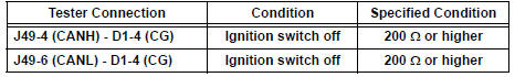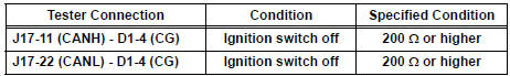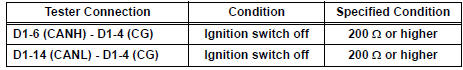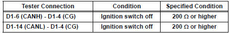 | The resistance between terminals 6 (CANH) and 4 (CG), or terminals 14 (CANL) and 4 (CG) of the DLC3 is below 200 Ω. |