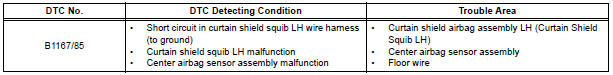 DTC B1167/85 is recorded when a short to ground is detected in the curtain shield squib LH circuit.
