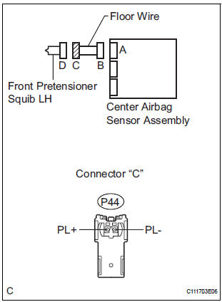 The front pretensioner squib LH circuit consists of the center airbag sensor assembly and the front seat outer belt assembly LH.