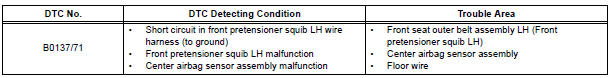 DTC B0137/71 is recorded when a short to ground is detected in the front pretensioner squib LH circuit.