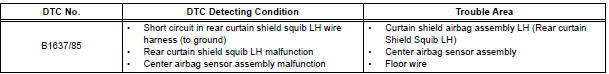 DTC B1637/85 is recorded when a short to ground is detected in the rear curtain shield squib LH circuit