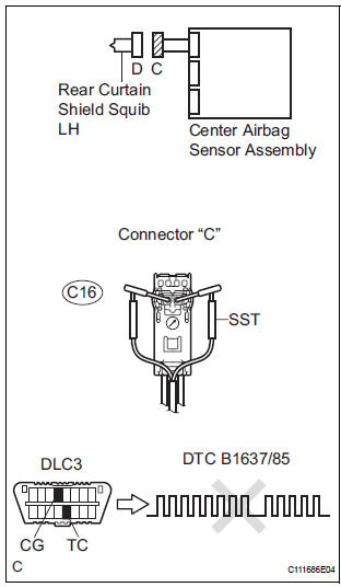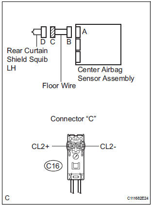 The rear curtain shield squib LH circuit consists of the center airbag sensor assembly and the curtain shield airbag assembly LH.