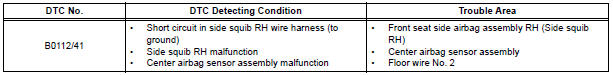 DTC B0112/41 is recorded when a short to ground is detected in the side squib RH circuit.