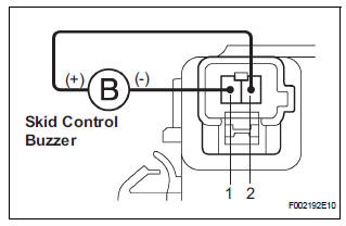 (b) Apply battery negative voltage to terminal 1, and battery positive voltage to terminal 2 of the skid control buzzer connector, and check that the buzzer sounds.