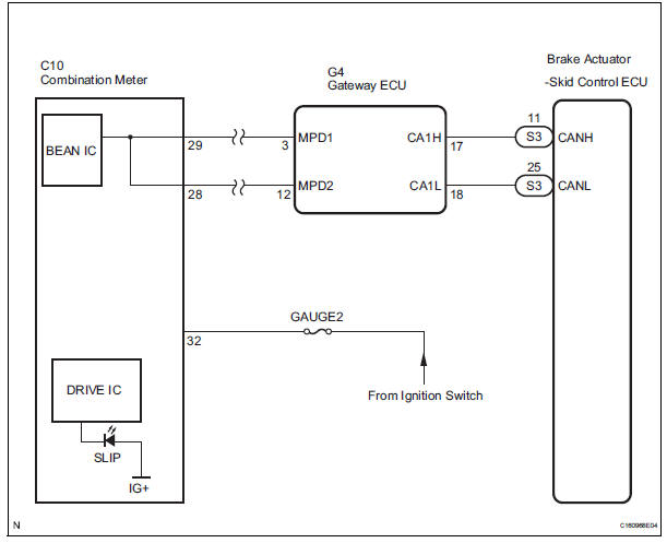 The skid control ECU is connected to the combination meter via CAN and multiplex communications.
