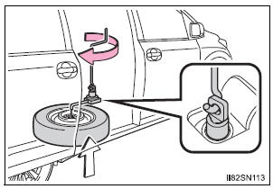 | NOTICE When loosening or tightening the spare tire clamp bolt Do not use an impact wrench. Use the adapter socket and jack handle. Be careful when driving over bumps with the compact spare tire installed on the vehicle The vehicle becomes lower when driving with the compact spare tire compared to when driving with standard tires. Be careful when driving over uneven road surfaces. Driving with tire chains and the compact spare tire Do not fit tire chains to the compact spare tire. Tire chains may damage the vehicle body and adversely affect driving performance. When replacing the tires When removing or fitting the wheels, tires or the tire pressure warning valve and transmitter, contact your Toyota dealer as the tire pressure warning valve and transmitter may be damaged if not handled correctly. To avoid damage to the tire pressure warning valves and transmitters When a tire is repaired with liquid sealants, the tire pressure warning valve and transmitter may not operate properly. If a liquid sealant is used, contact your Toyota dealer or other qualified service shop as soon as possible. Make sure to replace the tire pressure warning valve and transmitter when replacing the tire. After taking out or stowing the spare tire Make sure to secure the tire carrier by tightening the clamp bolt to prevent the holding bracket from hitting the under body of the vehicle during driving. Using the tire carrier