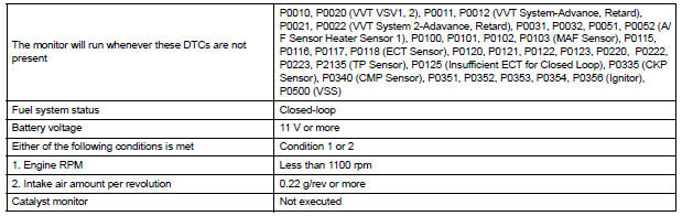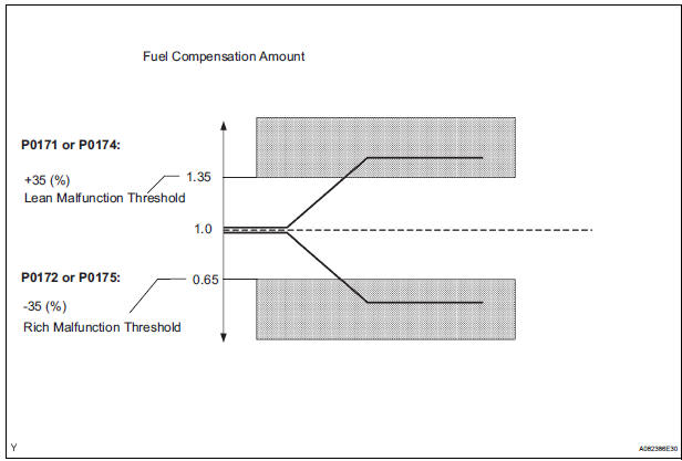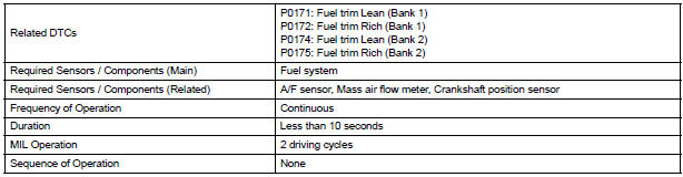 Under closed-loop fuel control, fuel injection volumes that deviate from those estimated by the ECM cause changes in the long-term fuel trim compensation value. The long-term fuel trim is adjusted when there are persistent deviations in the short-term fuel trim values. Deviations from the ECM's estimated fuel injection volumes also affect the average fuel trim learning value, which is a combination of the average short-term fuel trim (fuel feedback compensation value) and the average long-term fuel trim (learning value of the air-fuel ratio). If the average fuel trim learning value exceeds the malfunction thresholds, the ECM interprets this as a fault in the fuel system and sets a DTC.
