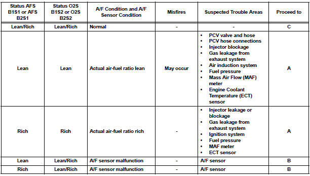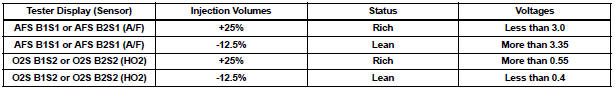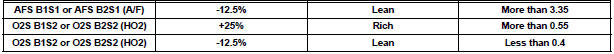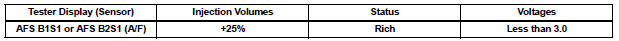 Rich: During A/F CONTROL, the AFS is consistently less than 3.0 V, and the O2S is consistently more than 0.55 V.