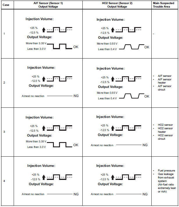 HINT: For use of the intelligent tester only: Malfunctioning areas can be identified by performing the A/F CONTROL function provided in the ACTIVE TEST. The A/F CONTROL function can help to determine whether the Air-Fuel Ratio (A/F) sensor, Heated Oxygen (HO2) sensor and other potential trouble areas are malfunctioning.