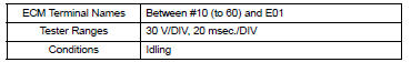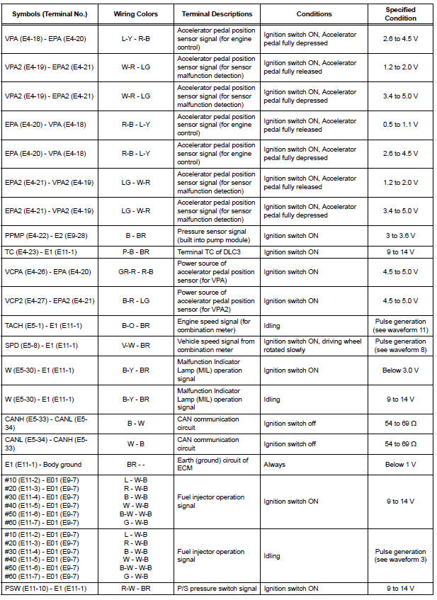 The standard normal voltage between each pair of the ECM terminals is shown in the table below. The appropriate conditions for checking each pair of the terminals are also indicated.