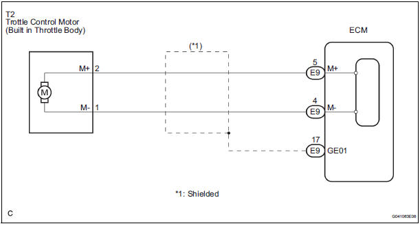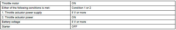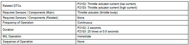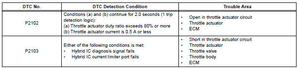 The ECM monitors the electrical current through the electronic actuator, and detects malfunctions and open circuits in the throttle actuator based on this value. If the current is outside the standard range, the ECM determines that there is a malfunction in the throttle actuator. In addition, if the throttle valve does not function properly (for example, stuck on), the ECM determines that there is a malfunction. The ECM then illuminates the MIL and sets a DTC.