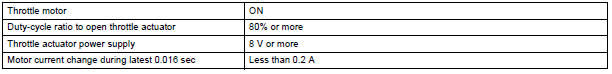 Example: When the electrical current is more than 10 A, or less than 0.5 A and the throttle actuator duty ratio exceeds 80%, the ECM interprets this as the current being outside the standard range, and illuminates the MIL and sets a DTC.