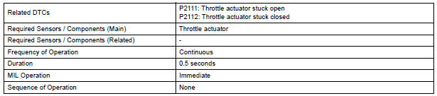 The ECM determines that there is a malfunction in the ETCS when the throttle valve remains at the fixed angle despite a high drive current from the ECM. The ECM illuminates the MIL and sets a DTC.