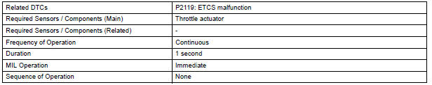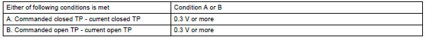 The ECM determines the actual opening angle of the throttle valve from the TP sensor signal. The actual opening angle is compared to the target opening angle commanded by the ECM. If the difference between these two values is outside the standard range, the ECM interprets this as a malfunction in the ETCS. The ECM then illuminates the MIL and sets the DTC.
