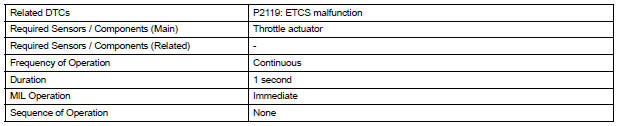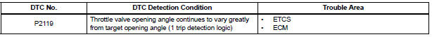 The ECM determines the actual opening angle of the throttle valve from the TP sensor signal. The actual opening angle is compared to the target opening angle commanded by the ECM. If the difference between these two values is outside the standard range, the ECM interprets this as a malfunction in the ETCS. The ECM then illuminates the MIL and sets the DTC.
