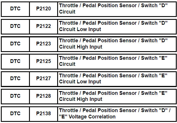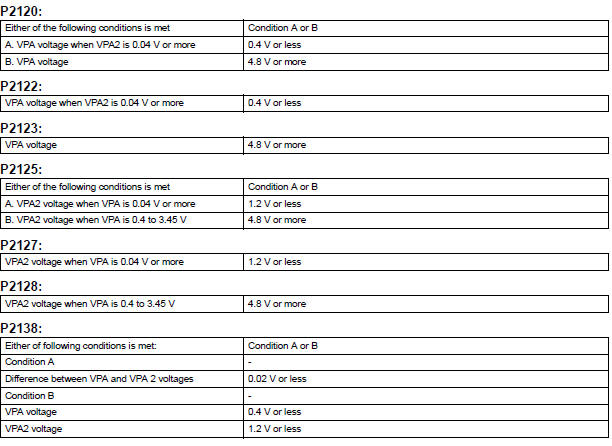 Example: When the voltage output of VPA drops below 0.4 V for more than 0.5 seconds when the accelerator pedal is fully depressed, DTC P2122 is set.
