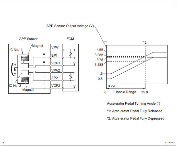 The Accelerator Pedal Position (APP) sensor is integrated with the accelerator pedal bracket and has 2 sensor circuits: VPA (main) and VPA2 (sub). This sensor is a non-contact type, and uses Hall-effect elements, in order to yield accurate signals, even in extreme driving conditions, such as at high speeds as well as very low speeds. The voltage, which is applied to terminals VPA and VPA2 of the ECM, varies between 0 V and 5 V in proportion to the operating angle of the accelerator pedal (throttle valve). A signal from VPA indicates the actual accelerator pedal opening angle (throttle valve opening angle) and is used for engine control. A signal from VPA2 conveys the status of the VPA circuit and is used to check the APP sensor itself.