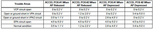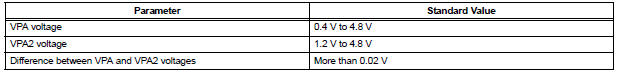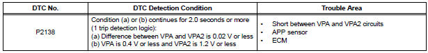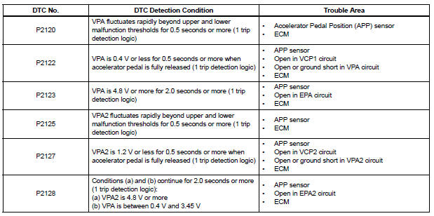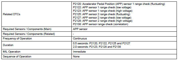When either of the voltage outputs of VPA or VPA2 deviates from the standard range, or the difference between the voltage outputs of the 2 sensor circuits is less than the threshold, the ECM determines that there is a malfunction in the APP sensor. The ECM then illuminates the MIL and sets a DTC.