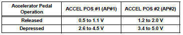When any of these DTCs are set, check the APP sensor voltage by selecting the following menu items on the intelligent tester: DIAGNOSIS / ENHANCED OBD II / DATA LIST / PRIMARY / ACCEL POS #1 and ACCEL POS #2.