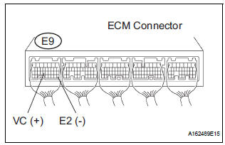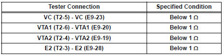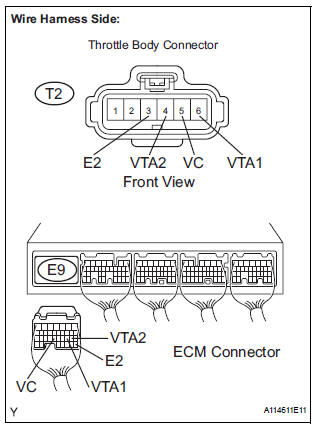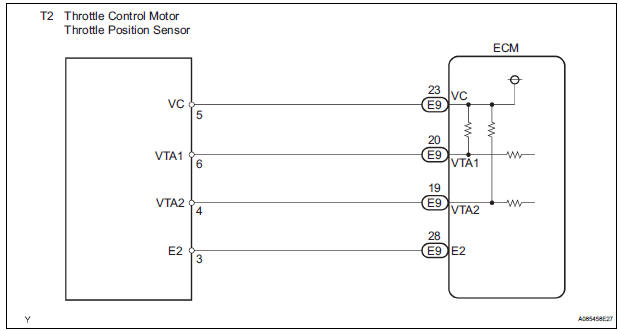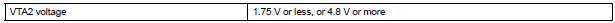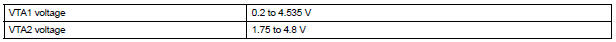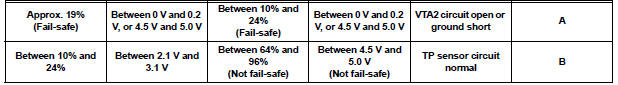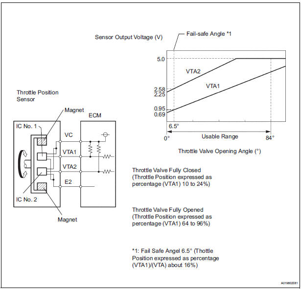 The TP sensor has two sensor circuits which each transmits a signal, VTA1 and VTA2. VTA1 is used to detect the throttle valve angle and VTA2 is used to detect malfunctions in VTA1. The sensor signal voltages vary between 0 V and 5 V in proportion to the throttle valve opening angle, and are transmitted to the VTA terminals of the ECM.
