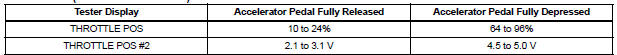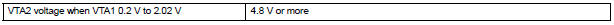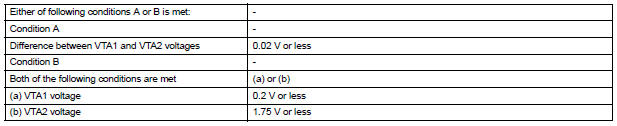 | P0223 | Output voltage of VTA2 is 4.8 V or more, and VTA1 is between 0.2 V and 2.02 V, for 2 seconds (1 trip detection logic) |
