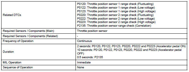 | P0120 | Output voltage of VTA1 quickly fluctuates beyond lower and upper malfunction thresholds for 2 seconds (1 trip detection logic) |
