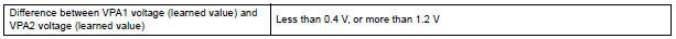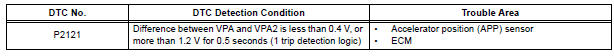 When the difference between the voltage outputs of VPA and VPA2 deviates from the standard, the ECM determines that the accelerator pedal position sensor is malfunctioning. The ECM turns on the MIL and the DTC is set.
