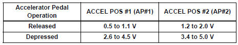The accelerator pedal position sensor has 2 (main and sub) sensor circuits. If a malfunction occurs in either of the sensor circuits, the ECM detects the abnormal signal voltage difference between the 2 sensor circuits and switches to limp mode. In limp mode, the functioning circuit is used to calculate the accelerator pedal opening angle to allow the vehicle to continue driving. If both circuits malfunction, the ECM regards the opening angle of the accelerator pedal as being fully closed. In this case, the throttle valve remains closed as if the engine is idling.