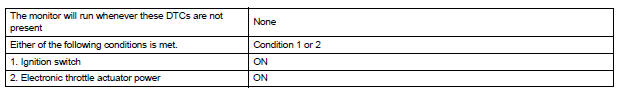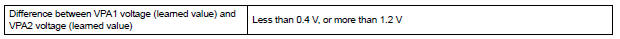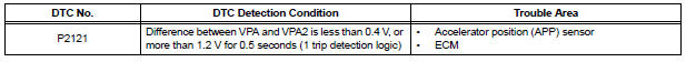 When the difference between the voltage outputs of VPA and VPA2 deviates from the standard, the ECM determines that the accelerator pedal position sensor is malfunctioning. The ECM turns on the MIL and the DTC is set.