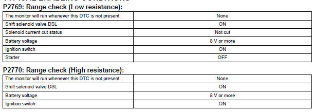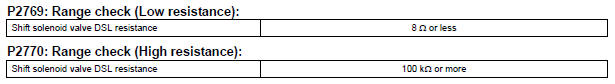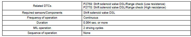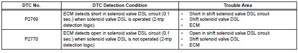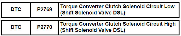 The ECM calculates the actual transmission gear by comparing input turbine rpm (NT) to counter gear rpm (NC). When conditions are appropriate, the ECM requests "lock-up" by applying control voltage to the shift solenoid DSL. When the DSL is opened, it applies pressure to the lock-up relay valve and locks the torque converter clutch. If the ECM detects an open or short in the DSL solenoid circuit, the ECM interprets this as a fault in the DSL solenoid or circuit. The ECM will turn on the MIL and store the DTC.