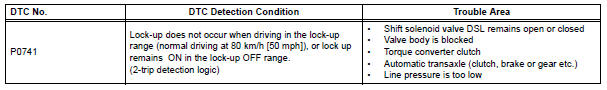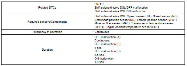 If the ECM detects no lock-up after lock-up has been requested or if it detects lock-up when it is not requested, the ECM interprets this as a fault in the shift solenoid valve DSL or lock-up system performance. The ECM will turn on the MIL and store the DTC.