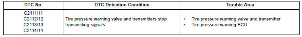 The tire pressure warning valve and transmitters that are installed in the tire and wheel assemblies measure the air pressures of the tires. The measured values are transmitted to the tire pressure warning antenna and receiver on the body as radio waves and then sent to the tire pressure warning ECU. The ECU compares the measured air pressure values with the air pressure threshold. When the measured air pressure value is less than this threshold, the warning light in the combination meter comes on. The tire pressure warning ECU stores a DTC when the tire pressure warning valve and transmitter stops transmitting signals. At this time, forcibly transmit the signals by releasing the tire pressure rapidly. The stored DTC is cleared when the signal transmission is resumed.