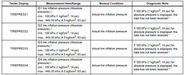 HINT: *: It may take about 5 to 6 minutes until the values are displayed. If the values are not displayed after about 5 to 6 minutes, perform troubleshooting according to the inspection procedure for DTCs C2121/21 to C2124/24 (See page TW-42).
