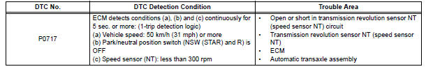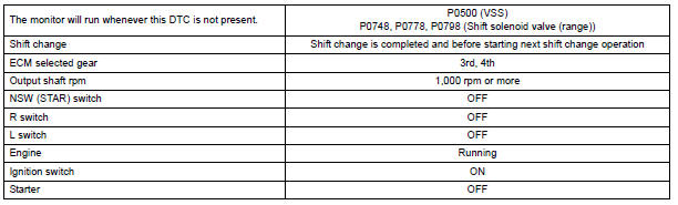 While the vehicle is operating in 2nd, 3rd, 4th or 5th gear in the shift position of D, if the input shaft revolution is less than 300 rpm *1although the output shaft revolution is more than 1,000 rpm *2, the ECM detects the trouble, illuminates the MIL and stores the DTC.