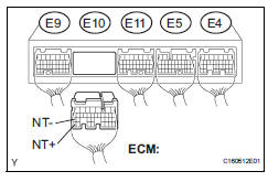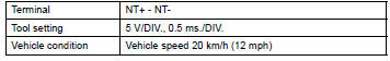 Reference (Using an oscilloscope): Check the waveform between terminals NT+ and NT- of the ECM connector.