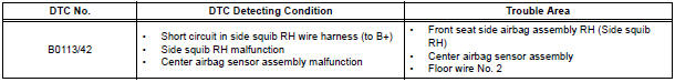 DTC B0113/42 is recorded when a short to B+ is detected in the side squib RH circuit.