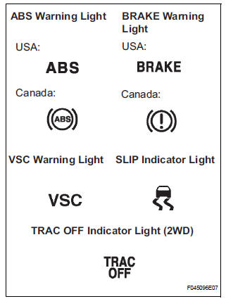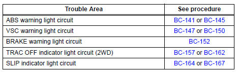 (2) When the ignition switch is turned to the ON position, check that the ABS warning light, BRAKE warning light, VSC warning light, TRAC OFF indicator light (2WD) and SLIP indicator light stay on for approx. 3 seconds.